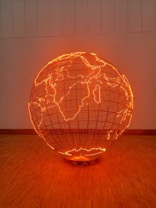 Zoals deze wereldbol. Hot Spot. Vlammend rood als in opwarming en onrust en conflict.