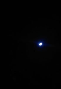 “Ehm, ik kan de maan helemaal niet vinden,” antwoord ik vanuit de achtertuin.